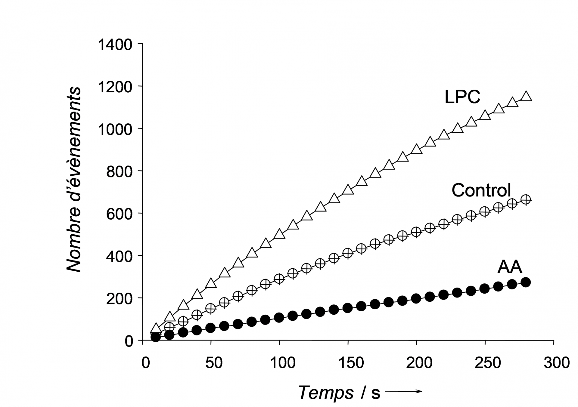Ces expériences de modification de la courbure membranaire lors de l’exocytose ont montré que la fréquence de sécrétion est grandement affectée par la présence d’une molécule fusogène (le LPC) ou antifusogène (l’AA) dans la membrane cellulaire (Figure 3). Le nombre d’évènements détectés sur les chronoampérogrammes est en effet quasiment doublé en présence d’une molécule fusogène et divisé par un facteur d’ordre 2 en présence d’une molécule antifusogène. La vitesse de chaque événement d’exocytose a cru ainsi que le nombre de molécules libérées qui a également augmenté d’un facteur 2 en présence de la molécule fusogène. La tendance opposée est observée pour l’acide gras antifusogène.