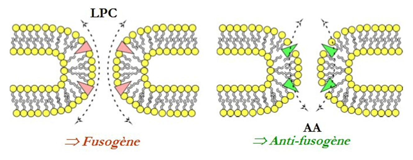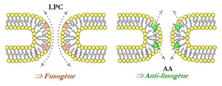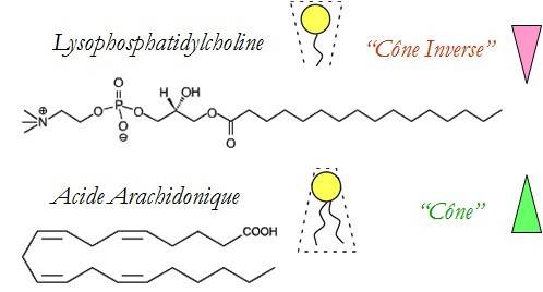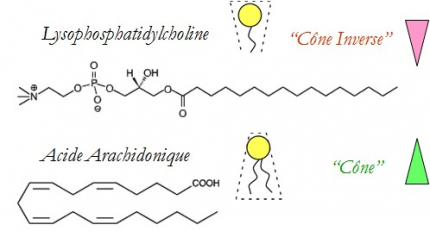 Les géométries des molécules choisies sont de deux types : l’une s’appelle la lysophosphatidylcholine, notée LPC, et l’autre est un acide gras, l’acide arachidonique, noté AA. La LPC a une forme de « cône inverse » qui contraint la courbure membranaire et l’accentue, favorisant ainsi la fusion membranaire et donc la fusion des vésicules de sécrétion avec la membrane cellulaire (Figure 1). On dit alors que le LPC est fusogène. À l’inverse, l’AA a une géométrie conique qui empêche la fusion membranaire et est dit antifusogène (Figure 2).