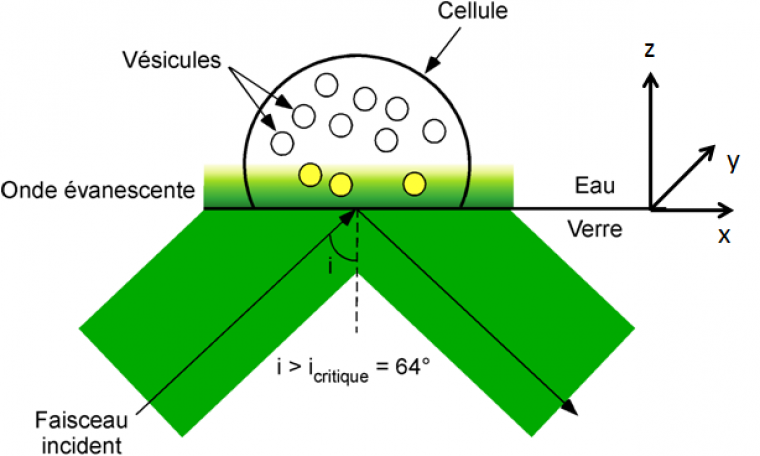 Cette technique optique s’appelle la microscopie à onde évanescente ou microscopie de fluorescence par réflexion totale interne (dite TIRF – Total Internal Reflexion Fluorescence Microscopy – en anglais). Le principe analytique de détection de l’exocytose par TIRF est le suivant. Les vésicules de sécrétion de la cellule sont marquées au préalable par une molécule fluorescente, située dans la membrane vésiculaire ou au cœur de la vésicule, au choix. Les cellules sont déposées sur une lame de microscope fine et transparente pour permettre l’excitation optique par un laser ou une diode. Le faisceau lumineux vient frapper l’interface lame de microscope/cellule avec un angle particulier, dit angle critique. S’ensuit alors la création d’une onde évanescente de faible profondeur de pénétration, d’intensité proportionnelle à une exponentielle décroissante en fonction de la distance z dans la direction perpendiculaire au substrat (représenté par la lame du microscope - Figure 4). L’excitation de la fluorescence des vésicules se fait ensuite par cette onde évanescente qui a une profondeur de pénétration de 50 à 300 nm, quand la cellule fait plutôt une épaisseur de quelques micromètres. En conséquence, seule l’évolution de la fluorescence des vésicules proches de la membrane cellulaire adhérée est suivie, ce qui limite la pollution des signaux par les vésicules marquées loin de l’interface cellule-verre. Les évènements d’exocytose sont vus sous la forme de flash ou d’extinction de fluorescence. Les avantages de cette technique sont la détection en temps réel des vésicules, l’observation de leur mouvement avec une bonne résolution dans le plan x-y parallèle au substrat et la localisation des évènements de fusion sur la membrane cellulaire.