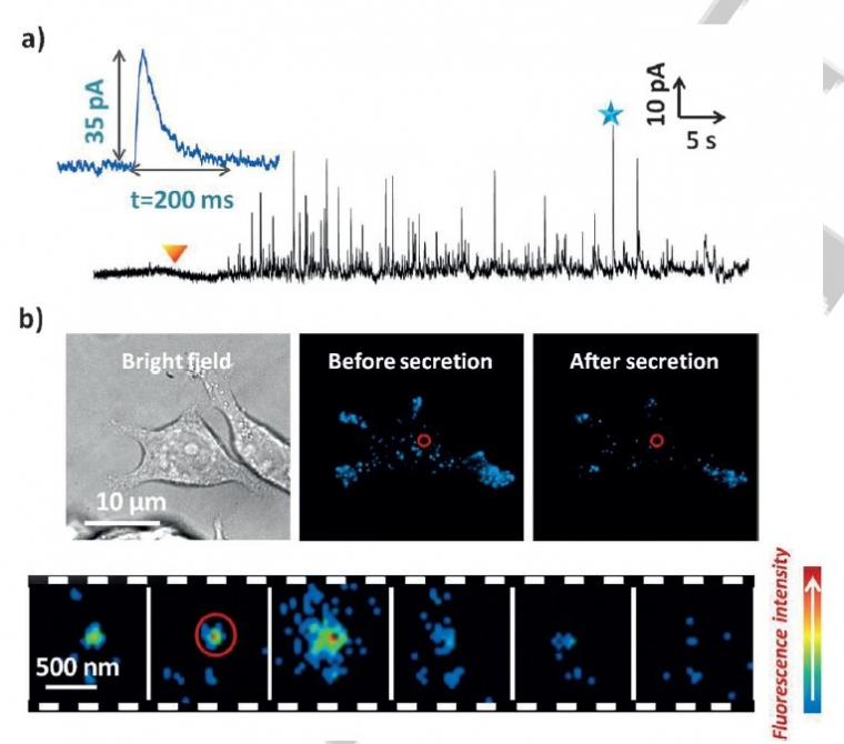 [2] Kisler K., Kim B., Liu X., Berberian K., Fang Q., Mathai C., Gangopadhyay S., Gillis K., Lindau M., Transparent Electrode Materials for Simultaneous Amperometric Detection of Exocytosis and Fluorescence Microscopy, Journal of Biomaterials and Nanobiotechnology, 2012, 3, p. 243-253 ; Meunier A. Jouannot O., Fulcrand R., Fanget I., Bretou M., Karatekin E., Arbault S., Guille M., Darchen F., Lemaître F., Amatore C., Coupling amperometry and total internal reflection fluorescence microscopy at ITO surfaces for monitoring exocytosis of single vesicles, Angew. Chem. Int. Ed., 2011, 50, 5081-5084.