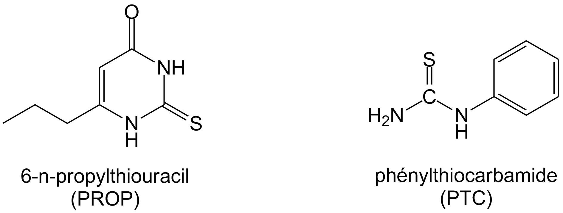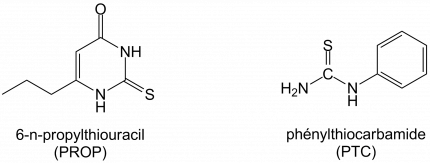 Il est connu depuis longtemps que la perception du goût varie énormément d’un individu à un autre mais aussi d’une population à une autre. Ainsi, des études sensorielles ont montré des différences de seuil de perception très importantes parmi les sujets humains. Des études génétiques ont montré que certaines pertes de la sensibilité gustative (agueusie1) pour certains composés pouvaient résulter d’un polymorphisme génétique2 d’un récepteur gustatif. Un des meilleurs exemples est la perception du 6-n-propylthiouracil (PROP) et du phénylthiocarbamide (PTC) (Figure 15).