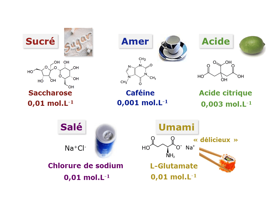 L’être humain comme la plupart des animaux est capable de percevoir et de distinguer cinq saveurs primaires différentes qualifiées également de fondamentales : le sucré, l’acide, l’amer et le salé et une cinquième saveur, moins connue du grand public, appelée saveur umami (Figure 4).