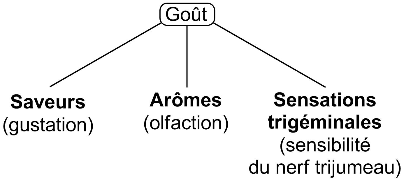 Lorsque nous dégustons un bon plat, tous nos sens sont en éveil. L’odorat est stimulé par les bonnes odeurs de cuisson, la vue par les aliments sur l’assiette et le vin dans le verre, l’ouïe par le croustillant ou le craquant des aliments, le toucher par leur texture en bouche, et bien entendu le goût. Le goût au sens commun du terme regroupe en réalité l’olfaction et la gustation. En effet, lors de la prise d’un aliment en bouche, les molécules sapides3 se solubilisent dans la salive et stimulent les bourgeons du goût situés dans les papilles de la langue (voir Figure 6) : la sensation perçue est appelée saveur. Quant aux molécules odorantes, qui sont volatiles, elles remontent vers la cavité nasale par l’arrière du voile du palais pour aller stimuler notre système olfactif. On parle alors de stimulation olfactive par la voie rétro-nasale. Ce qui nous donne l'arôme. On devrait alors parler de flaveur4, terme regroupant l’ensemble des sensations perçues par les voies olfactives et gustatives, à savoir l’arôme et la saveur (Figure 1).