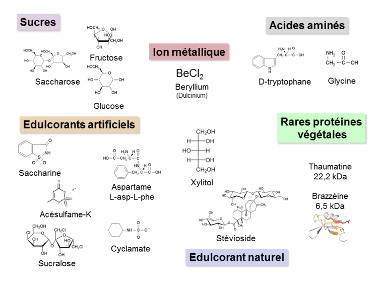 Les molécules capables de générer un goût sucré chez l'Homme sont aussi très diverses chimiquement (Figure 10), bien que le nombre de composés sucrés soit relativement limité.