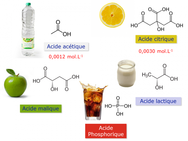 La perception de l’acidité est quant à elle directement liée à la détection des protons (H+). Cette saveur signale la présence d'acides pouvant être dangereux pour notre corps : elle permet notamment d'éviter la consommation de fruits non mûrs ou d'aliments contaminés par des micro-organismes qui produisent des acides lors de la fermentation. De nombreux acides tels que les acides acétique, chlorhydrique, citrique, sulfurique, lactique, malique, tartrique sont à l'origine d'un goût acide (Figure 13).