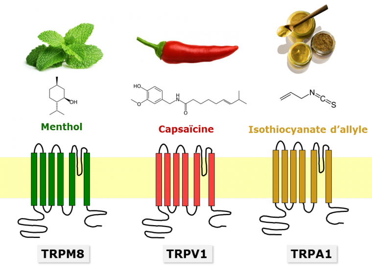 Une molécule présente dans le piment, la capsaïcine, active quant-à-elle un canal ionique de la même famille (TRPV1) sensible à la chaleur, d’où la sensation de brûlure. Les molécules piquantes de la moutarde, du wasabi, des radis, du poivre ou certaines herbes comme le thym sont aussi perçues par des détecteurs sensibles à la température. Dans le cas de la moutarde, la molécule responsable du caractère piquant (isothiocyanate d’allyle) est perçue par le canal TRPA1.