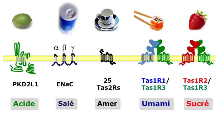 Le goût est un sens chimique qui nous permet d’évaluer le contenu nutritif des aliments. Ce sens est essentiel à la survie de la plupart des animaux. La détection des molécules sucrées et des acides aminés permet d’identifier et de choisir des aliments riches en énergie ou en protéines. La perception de ces molécules est à l’origine de saveurs agréables et ces composés sont en général appétants1. À l’inverse, la perception de l’amertume est en général désagréable ou aversive2. La détection de l’amer permet d’identifier des composés toxiques, par exemple certains alcaloïdes végétaux, parmi lesquels se trouvent des poisons mortels. Détecter le goût salé est de première importance pour maintenir l’équilibre électrolytique de notre organisme. En effet, notre corps perd constamment des ions sodium Na+ lors de processus excrétoires et sécrétoires (urine et transpiration principalement). C’est pour ces raisons que nous sommes attirés et que nous aimons le sel (chlorure de sodium, NaCl). Quant au goût acide, il nous permet d’évaluer la maturité des fruits ou la présence d’une contamination microbienne dans un aliment. Ce goût nous permet aussi de protéger notre corps contre une consommation d’acides à trop forte concentration qui pourraient endommager notre dentition ou notre appareil digestif.