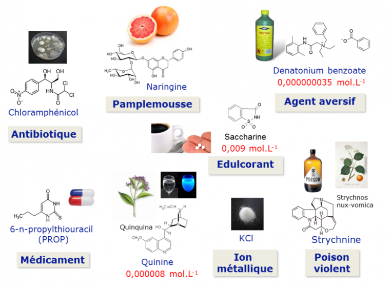 Les molécules amères que l’on trouve dans la nature ont principalement une origine végétale mais elles peuvent aussi être produites par des champignons ou des micro-organismes (par exemple, le chloramphénicol, antibiotique isolé pour la première fois dans une culture de bactéries Streptomyces venezuelae, a un goût amer). De nombreuses molécules de synthèse ont un goût amer très puissant. C’est le cas du benzoate de dénatonium qui est détecté à un seuil de détection très faible (0,000000035 mol.L-1). Ce composé non toxique est utilisé dans des cosmétiques, alcools à usage domestique ou des engrais comme agent dénaturant ou aversif pour éviter l’ingestion de ces produits.