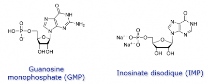 L’ion glutamate est par ailleurs couramment utilisé dans l’industrie agro-alimentaire pour renforcer les autres saveurs (rôle d’exhausteur de goût), sous forme de glutamate monosodique. La saveur umami a une caractéristique particulière : le phénomène de synergie. En effet, deux molécules du type 5’-ribonucléotide, l’inosine-5’-monophosphate (IMP) et le guanosine-5’-monophosphate (GMP), dérivés d’ADN que l’on trouve dans certains aliments et dans des extraits de levure, génèrent un goût umami et sont en plus capables de renforcer la saveur du L-glutamate (Figure 12).