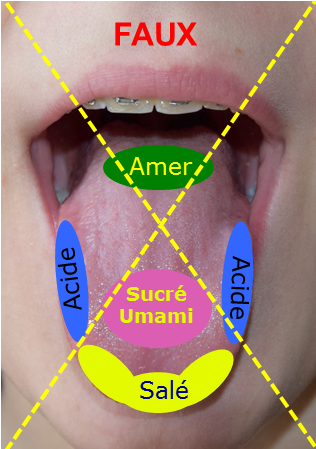 La carte des saveurs qui voudrait que les papilles sensibles aux différentes saveurs soient réparties dans différentes zones sur la langue est fausse (Figure 7).