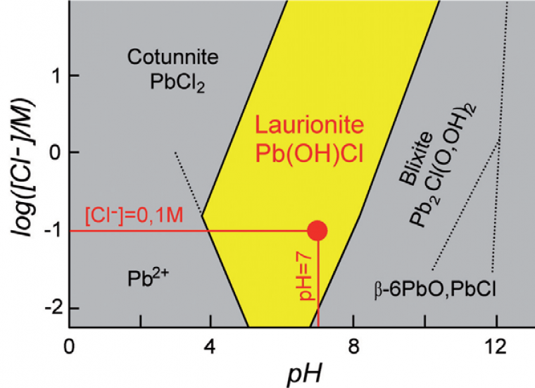 En interprétant celui du plomb (figure 4), on se rend compte que la recette proposée par Dioscoride pose un problème majeur : la laurionite a un domaine de stabilité limité à un pH compris entre 5 et 8.