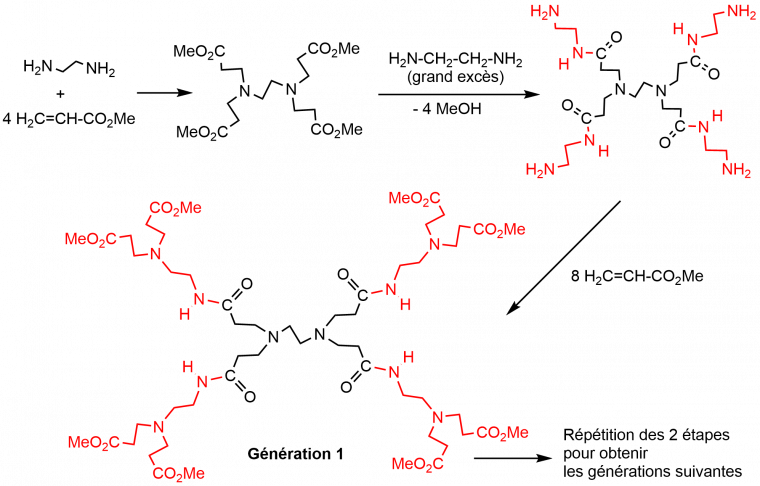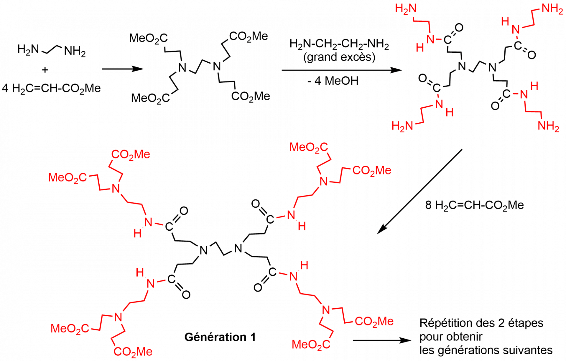 Les dendrimères de type PolyAMidoAMine (PAMAM) ont été synthétisés aux USA dans les années 80 par Donald A. Tomalia [2], qui a aussi créé le mot « dendrimère » à partir du grec « dendros » (arbre) et « meros » (partie). Ces dendrimères sont généralement synthétisés à partir d’un cœur éthylène diamine, sur lequel sont greffés 4 équivalents d’acrylate de méthyle, la deuxième étape étant une réaction avec un excès d’éthylène diamine, qui donne des amines primaires en surface à partir desquelles le processus réactionnel est répété (Figure 2).