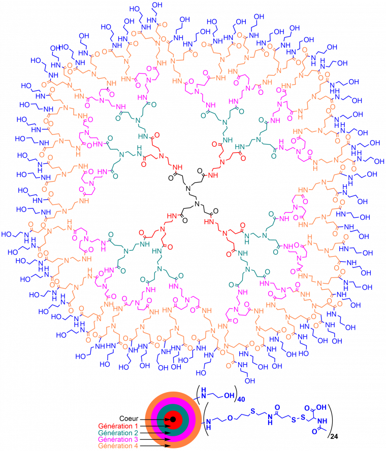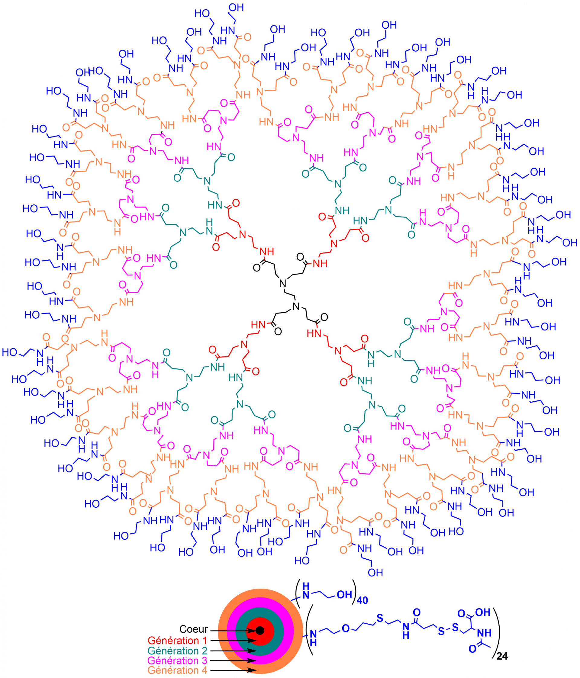Ces dendrimères ont été synthétisés jusqu’à la dixième génération. La 4ème génération d’un dendrimère PAMAM, fonctionnalisé en surface par des groupement hydroxy, est illustrée sur la Figure 3. Ces dendrimères PAMAM ont été les premiers commercialisés (ils le sont toujours), ils sont les plus connus et les plus utilisés en recherche. Cependant, du fait de la difficulté à les obtenir avec une pureté suffisante, et de leur relative fragilité chimique, très peu d’essais cliniques ont été effectués avec les dendrimères PAMAM. Malgré ces problèmes, quelques essais cliniques dans les domaines de l’ophtalmologie, la neurologie, les maladies inflammatoires (y compris les effets du Covid-19), et l’oncologie ont été menés ou sont en cours avec des dendrimères PAMAM. Ces dendrimères PAMAM sont fonctionnalisés par des groupements hydroxy et aléatoirement par diverses autres fonctions en surface. Un exemple, schématisé dans la Figure 3, a été utilisé comme anti-inflammatoire sur des patients hospitalisés, souffrant d’une forme sévère de la Covid-19, chez lesquels il a permis une diminution forte de la morbidité1 et surtout de la mortalité [3].