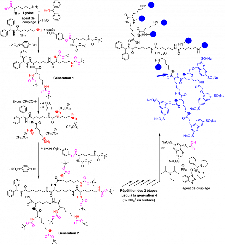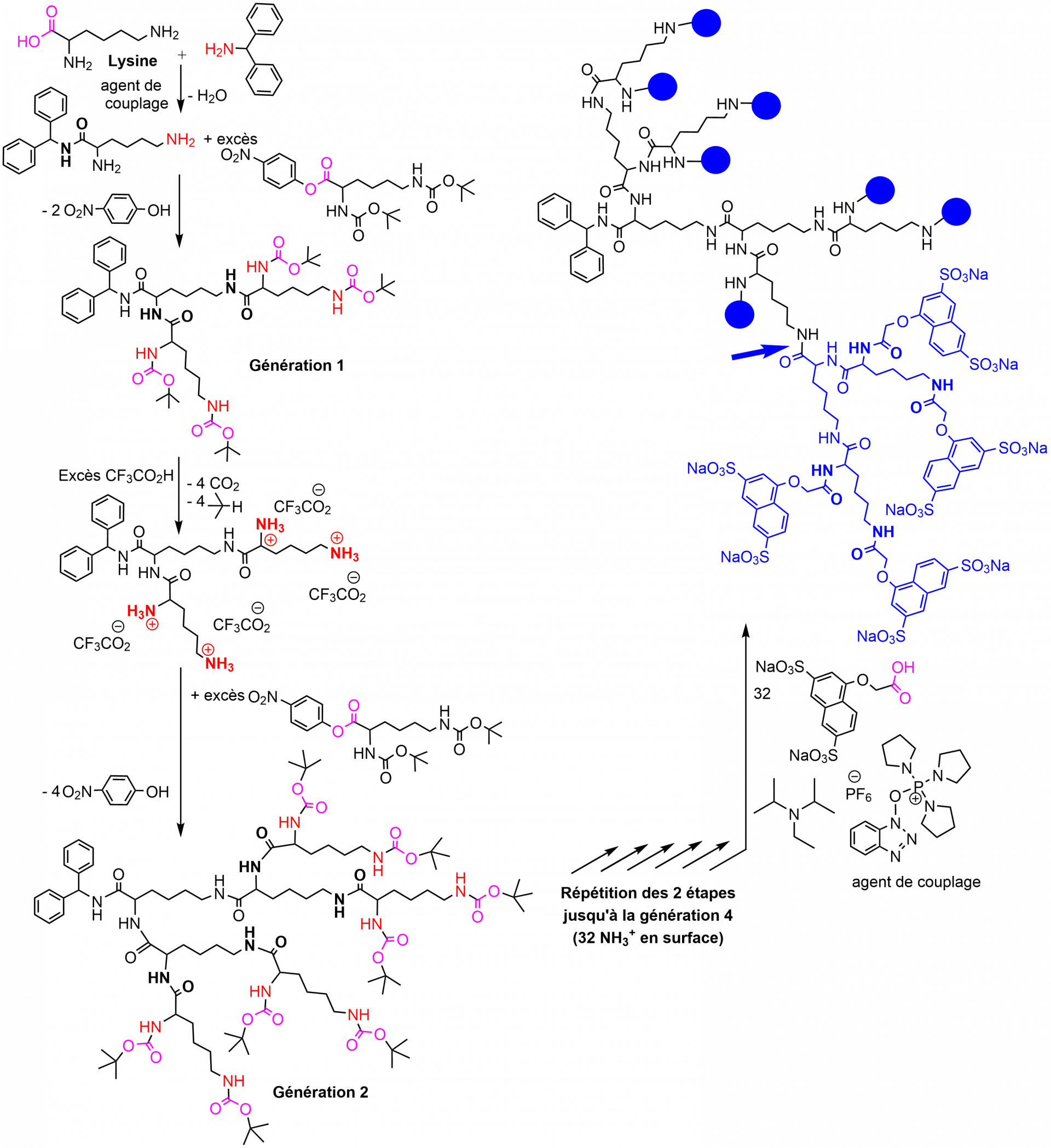 Les dendrimères poly(L-Lysine) ont été les premiers brevetés [4]. Ils sont généralement synthétisés à partir d’un cœur benzhydrylamine, par la répétition d’une séquence de protection/déprotection du N,N’-bis(tert-butoxycarbonyl)-L-lysine nitrophénylester, comme illustré dans la Figure 4. Comme les PAMAM, ces dendrimères ont aussi été synthétisés jusqu’à la dixième génération. Du fait de leur constitution à base d’aminoacides, qui permettait de penser qu’ils seraient bien tolérés, ces dendrimères ont été très tôt utilisés dans de nombreux essais de phases cliniques. La génération 4, fonctionnalisée en surface par 32 groupes 1-(carboxyméthoxy)-naphthalène-3,6-disulfonate sel de sodium (Figure 4), est commercialisée sous forme de gel pour le traitement de la vaginose bactérienne, sous le nom de VivaGel®. Ce gel est également utilisé comme lubrifiant de certains préservatifs. Les premières phases cliniques avec ce gel, il y a une vingtaine d’années, avaient aussi concerné les virus, en particulier le VIH, mais ils ont été abandonnés pour cette utilisation, par manque d’efficacité. Ce même dendrimère a été récemment reformulé sous forme de spray nasal pour prévenir les infections contre la Covid-19, sous le nom de VIRALEZETM [3].