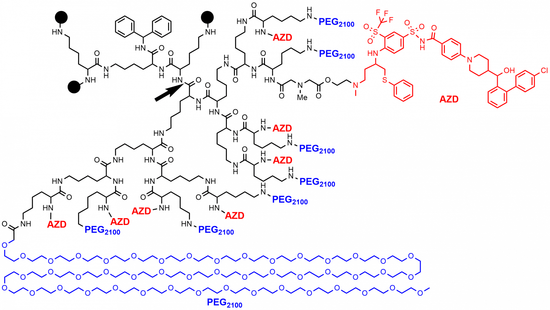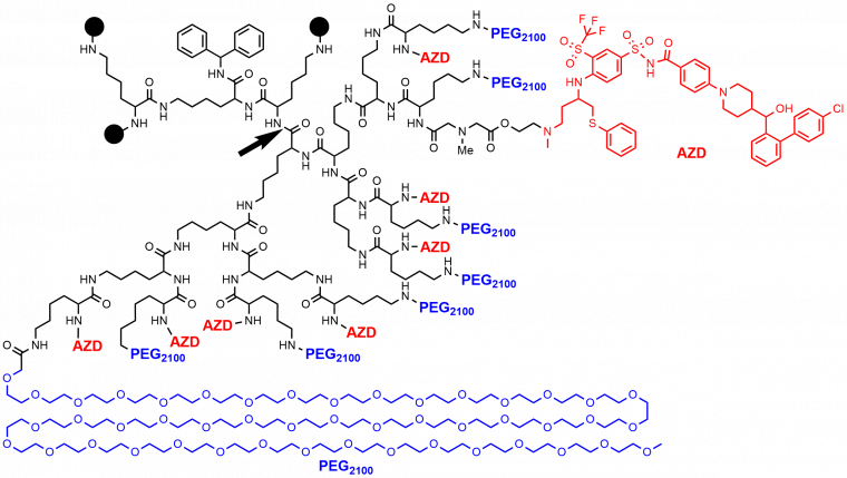 Des dendrimères poly(L-Lysine) de génération 5 ayant deux types de fonctions différentes en surface, en particulier celui appelé AZD0466 (Figure 5), ont fait récemment (2019-2022) l’objet d’essais cliniques de phases 1 et 2, dans le domaine de l’oncologie (tumeurs solides dans un état avancé, lymphomes, myélome multiple, cancers hématologiques, lymphomes non-Hodgkiniens) [3].