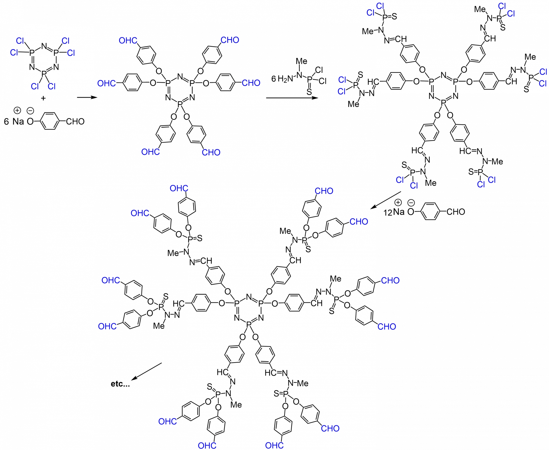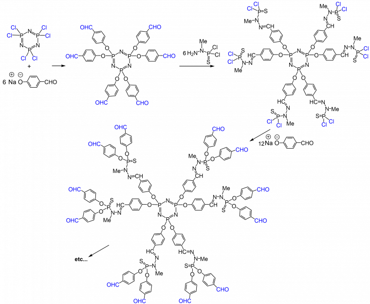 À la différence des dendrimères PAMAM et Poly-L-Lysine, qui ont une structure interne hydrophile, les dendrimères poly(phosphorhydrazone) (PPH) ont une structure interne hydrophobe, constituée en particulier de cycles aromatiques. Ils sont construits à partir d’un cœur trifonctionnel (S=PCl3) [5] ou hexafonctionnel (N3P3Cl6) sur lequel est greffé le 4-hydroxybenzaldéhyde en milieu basique. La deuxième étape est une réaction de condensation des aldéhydes avec le phosphorhydrazide H2NNMeP(S)Cl2 (Figure 6). Cette méthode de synthèse est très modulable et a permis d’obtenir des architectures dendritiques très sophistiquées [6]. Ces dendrimères ont été synthétisés jusqu’à la douzième génération à partir du cœur trifonctionnel, et jusqu’à la huitième génération à partir du cœur hexafonctionnel. Ces dendrimères étant hydrophobes, il est nécessaire de greffer des groupements hydrophiles en surface, tels que des groupements ammoniums ou phosphonates pour les rendre solubles dans l’eau, et donc utilisables en milieu biologique.
