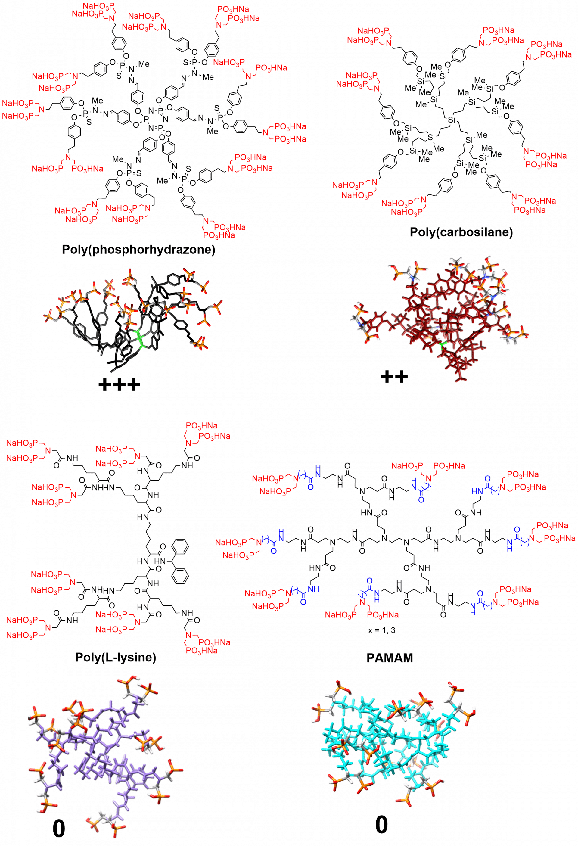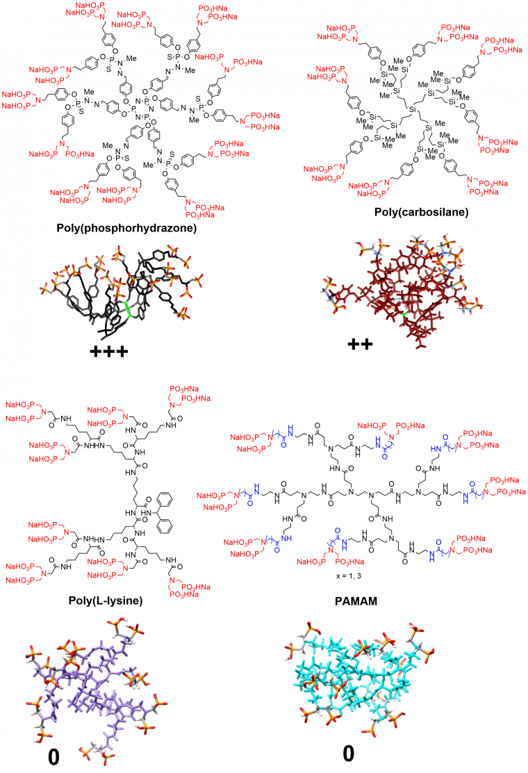 L’utilisation biologique la plus avancée avec les dendrimères poly(phosphorhydrazone) permet de rééquilibrer le système immunitaire humain (les globules blancs), grâce un dendrimère de 1ère génération ayant 12 groupements azabisphosphonates en surface. Lors de l’étude de structure / activité effectuée après cette découverte, une série de dendrimères, ayant des intérieurs différents mais les mêmes fonctions de surface, a été synthétisée. Contrairement à un consensus qui considérait que l’intérieur des dendrimères servait seulement de support aux fonctions terminales, qui seules avaient une activité, ces travaux ont montré que la structure interne des dendrimères pouvait avoir une influence cruciale sur les propriétés, en particulier dans le domaine biologique. La Figure 7 montre certains des dendrimères qui ont été synthétisés pour cette étude, leur efficacité sur l’activation anti-inflammatoire des monocytes (un type de globules blancs), et leur structure tridimensionnelle dans l’eau, obtenue par modélisation en dynamique moléculaire. Cette modélisation s’est avérée cruciale pour comprendre les différences d’activité observées. En effet, seuls les dendrimères ayant toutes leurs fonctions terminales rassemblées d’un côté de la molécule (cas des dendrimères à structure interne hydrophobe, comme poly(phosphorhydrazone) et poly(carbosilane)) sont actifs. Par contre, les dendrimères ayant les fonctions terminales réparties sur toute la surface (cas des dendrimères à structure interne hydrophile, comme poly(Lysine) et PAMAM) ne sont pas actifs. La start-up IMD-Pharma a été créée pour amener dans les années prochaines le dendrimère le plus actif dans un essai clinique de phase 1 [8].