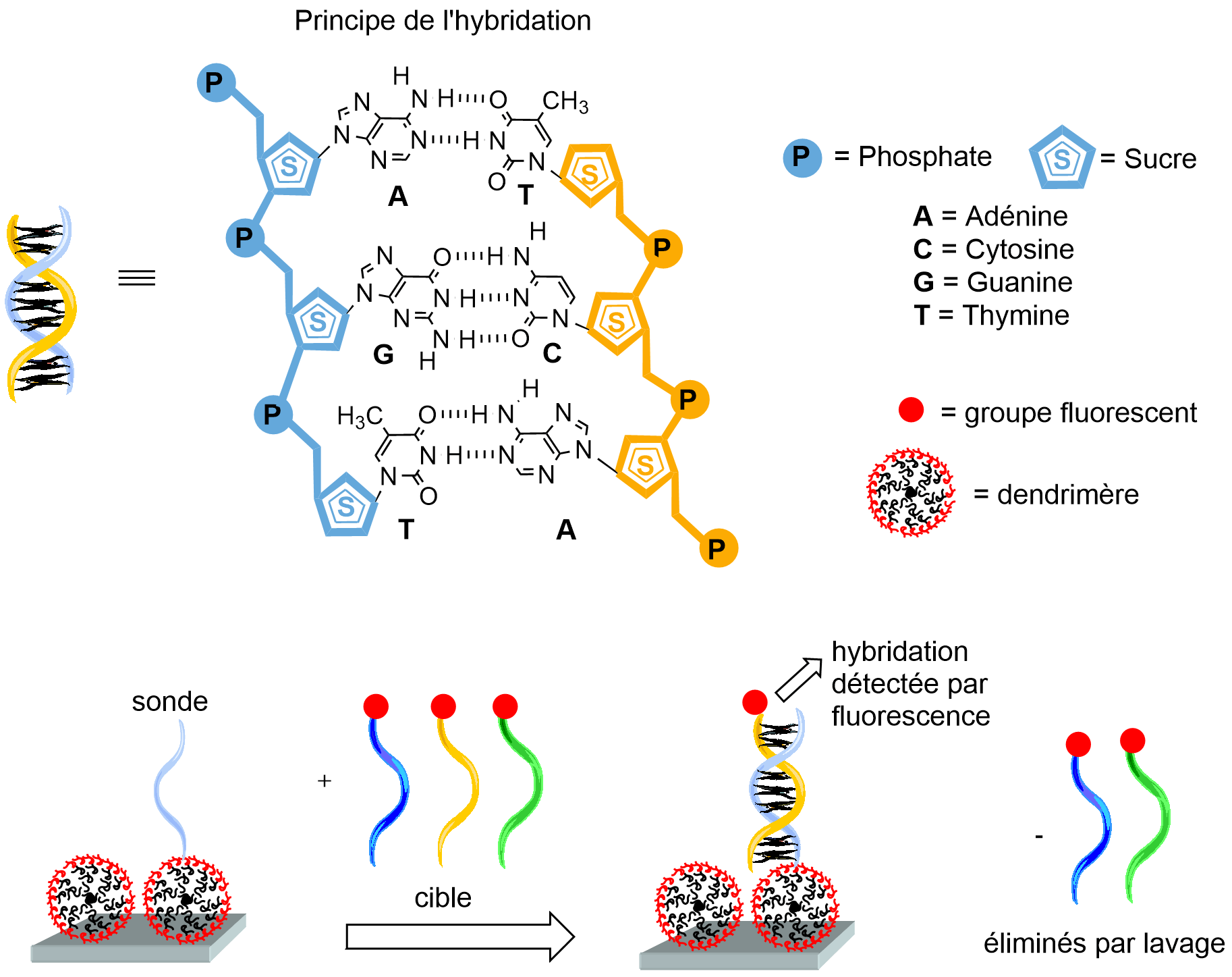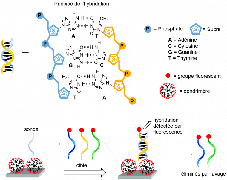 Des dendrimères sont utilisés comme espaceurs tridimensionnels sur des puces de diagnostic (puces à ADN). Le processus est basé sur la capacité d’association de deux brins d’ADN complémentaires, qui s’appelle l’hybridation. L’un des deux brins est synthétisé : sa structure est parfaitement connue, et il est greffé sur la puce. L’autre brin est naturel et prélevé chez le patient ; il est légèrement modifié par le greffage d’un groupement fluorescent. L’association des deux brins d’ADN ne peut se faire que si le brin naturel est complémentaire au brin synthétique, et leur hybridation est détectée par fluorescence. Les dendrimères augmentent la distance entre la surface solide de la puce et le brin synthétique (appelé « sonde »), permettant d’accroître l’efficacité du piégeage du brin naturel (appelé « cible ») par hybridation. Ce processus d’hybridation devient alors aussi efficace qu’en solution, ce qui n’est pas le cas en l’absence de dendrimère. Ce concept, illustré sur la Figure 8, a été appliqué très tôt avec des dendrimères PAMAM. Il est notamment utilisé dans l’analyseur Stratus®CS*, qui fournit des tests cardiaques quantitatifs, pour une évaluation rapide et précise des patients présentant une suspicion d’ischémie myocardique1 dans les services d’urgence [9]. Différents types de puces, selon la maladie à détecter, ont aussi été élaborés par la start-up Dendris [10] avec des dendrimères phosphorés. « DendrisKIT RD » concerne la détection simultanée de 10 bactéries couramment impliquées dans les infections respiratoires (pneumonies) et est actuellement utilisée dans les services pneumologiques d’une quinzaine d’hôpitaux français. « DendrisKIT OA » permet la détection de 22 bactéries responsables d’infections ostéoarticulaires2. « DendrisKIT DP » est dédié à l’identification de 12 champignons impliqués dans la dermatophytose3, tandis que « DendrisKIT ST » est dédié à l’identification de 10 pathogènes (bactéries, levures, et virus) responsables d’infections sexuellement transmissibles [10]. Des puces à façon peuvent aussi être produites, en modifiant le design des sondes (l’ADN synthétique).