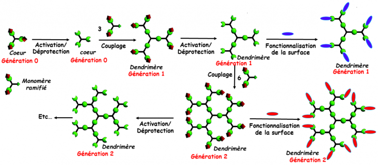 Les dendrimères, aussi appelés arbres moléculaires à cause de leur structure qui ressemble à la ramure des arbres, sont des macromolécules hyper-ramifiées tri-dimensionnelles. Les dendrimères sont synthétisés par la répétition d’une séquence de réactions, qui permet à la fois de faire grandir leur structure, et de multiplier le nombre de fonctions en surface, d’une façon prédéterminée et parfaitement contrôlée. Une nouvelle génération est créée chaque fois que le nombre de fonctions terminales est multiplié, généralement par 2 ou 3. Deux étapes sont généralement nécessaires pour créer une nouvelle génération, une étape de modification/activation des fonctions terminales pour les rendre compatibles avec le greffage d’un monomère ramifié qui constitue la deuxième étape. La Figure 1 illustre le principe de synthèse des dendrimères par une méthode divergente, c’est-à-dire à partir d’un cœur central, ayant lui-même plusieurs fonctions. Il existe aussi une méthode de synthèse convergente, de la périphérie vers le cœur, mais elle est beaucoup moins utilisée. À chaque étape de la synthèse, il est possible de modifier les fonctions terminales pour donner aux dendrimères les propriétés que l’on souhaite, par exemple la solubilité dans l’eau, qui facilite en particulier leur utilisation dans le domaine de la biologie.