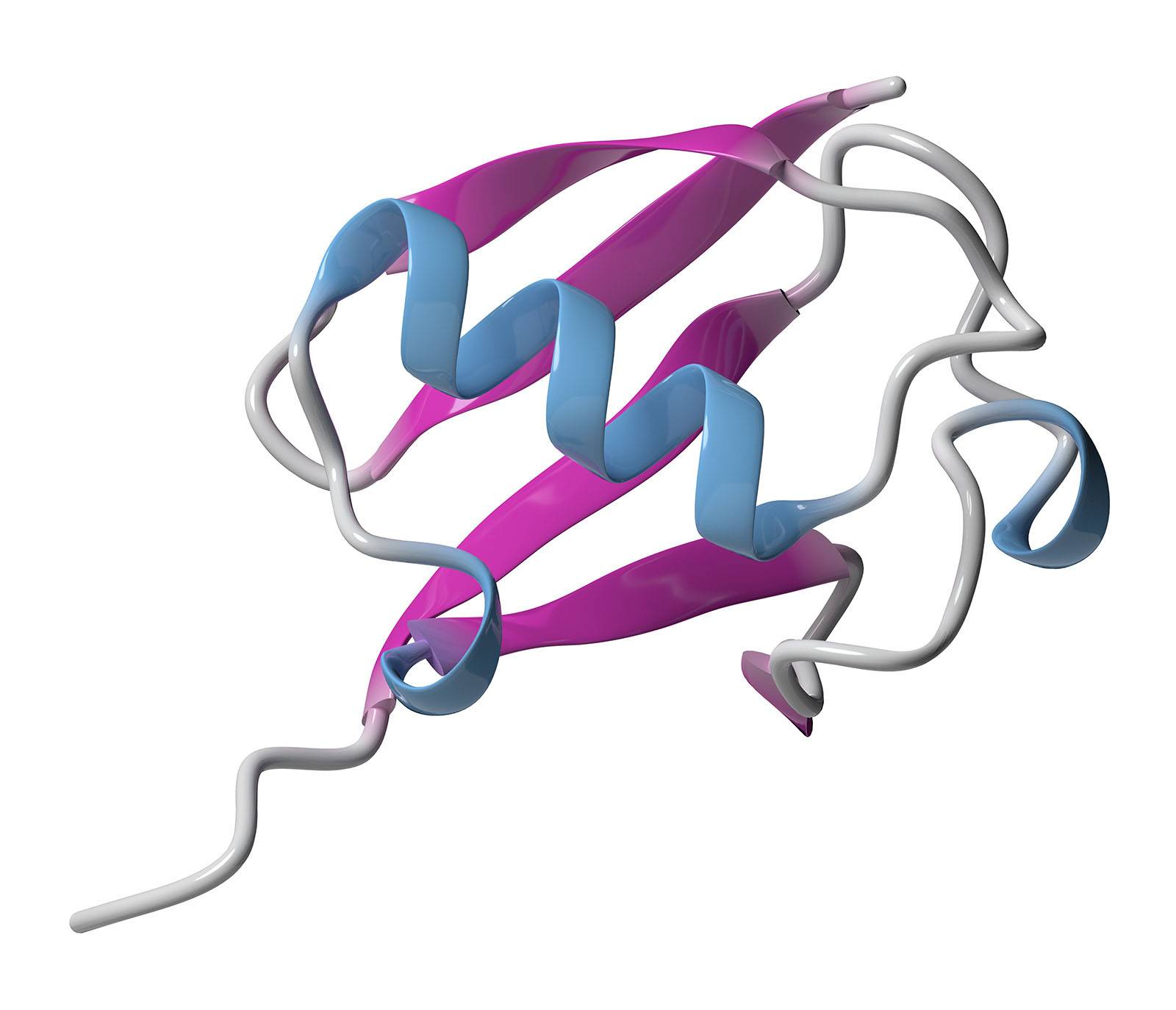 Les lauréats du prix Nobel ont découvert la nature de cette étiquette et élucidé son rôle dans la chaîne de dégradation. C'est un polypeptide composé de 76 acides aminés que l'on trouve dans la plupart des organismes vivants : l'ubiquitine (du latin ubique : partout) dont la strucure est donnée figure 11.