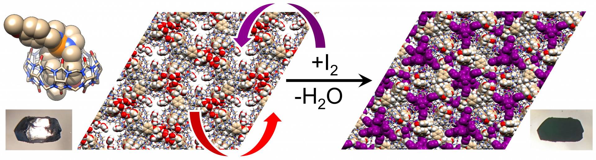 Il consiste en des cristaux moléculaires formés par l’empilement de complexes hôte-invité1 qui présentent des propriétés exceptionnelles d’adsorption de molécules de diiode. En effet, ces cristaux comportent des canaux qui montrent une forte affinité pour les molécules de diiode qu’ils capturent spontanément et sélectivement, même lorsque ces canaux sont remplis d’eau.