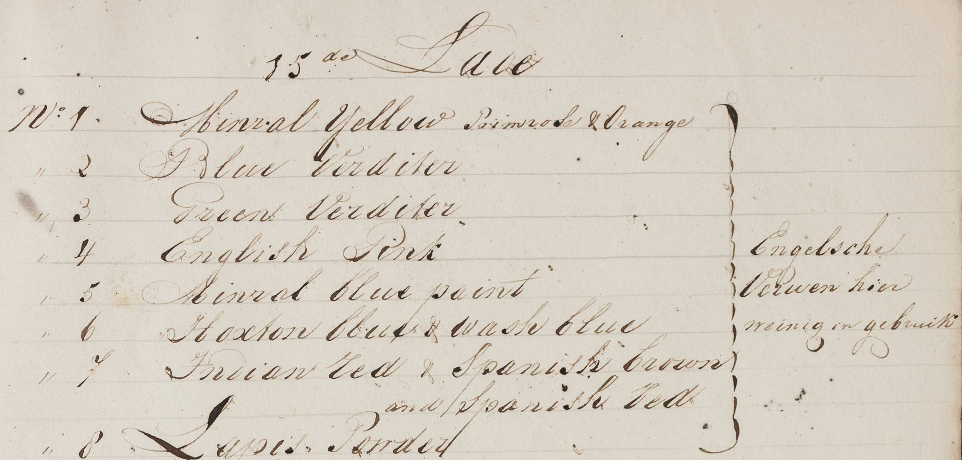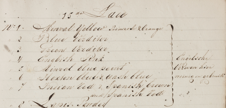 - For full details, see: Ineke Pey and Ernst Homburg, Een kabinet vol kleur: De collectie schildersmaterialen van de Amsterdamse verfhandelaar Michiel Hafkenscheid (1772-1846) (Nijmegen: Vantilt, 2018).
