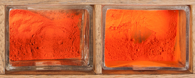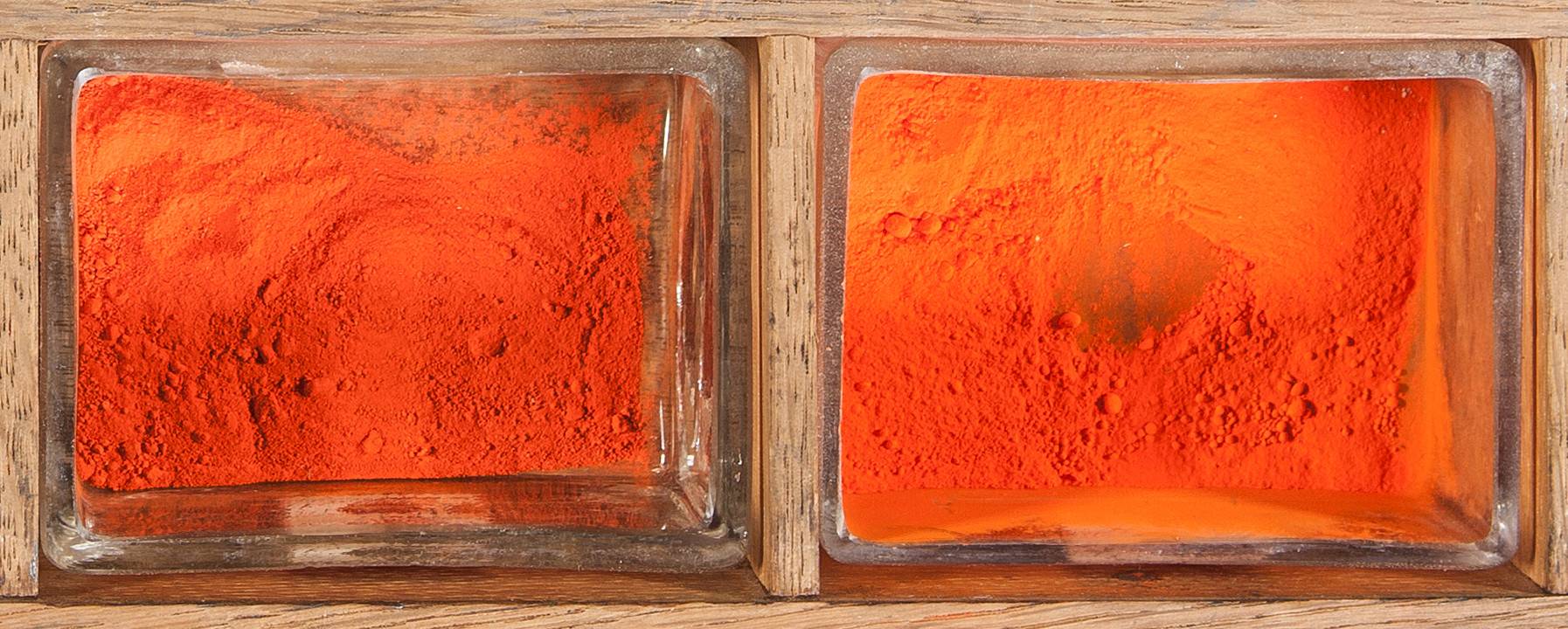 Two samples of red lead in drawer 9 of the cabinet. To the left is a sample of ordinary minium; to the right, the sample of ‘orange mineral’ from Paris. The investigation of that sample is described here, and the microscopic picture of some crystals is shown.