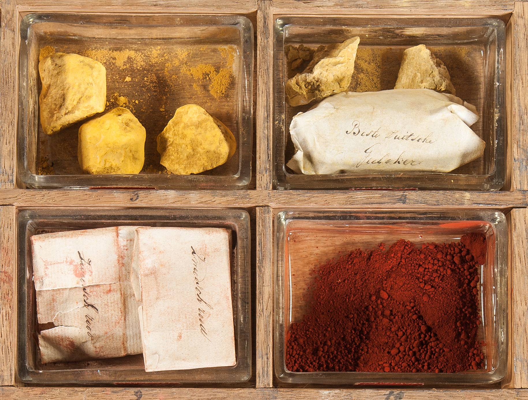 As a result of the long history of the firm, it is understandable that there are also some samples from before 1806 in the collection. On the basis of written dates found on paper wrappers around some samples, as well as on the inventory from the 1830s, it appears that the oldest samples found in the collection were a green pigment from berries (eighteenth century), amber (1802), Dutch pink (1803), Naples yellow (1804) and caput mortuum (iron ochres) (1804). The newest samples mentioned in these written sources were rottenstone (1831) and turmeric (1832).1