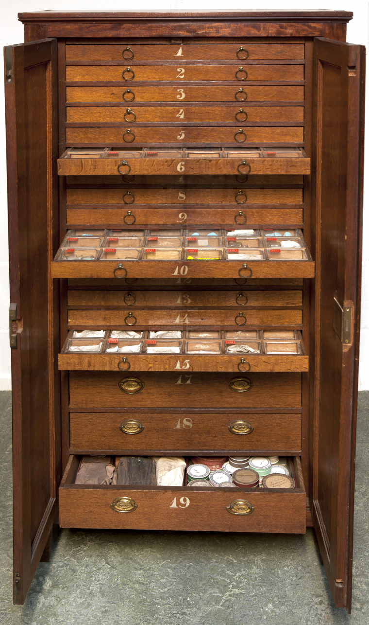 The mahogany wooden Hafkenscheid cabinet from about 1800. The first 15 drawers contain the Hafkenscheid collection of chemical materials, dating ca. 1800-1825. The lower drawers mostly contain objects from a later date.