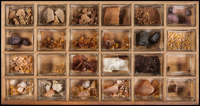 The Hafkenscheid Collection includes more than 370 samples or materials of various kinds, such as pigments, gums, resins, adhesives, mordants, metal ores, chemicals and natural dyes, mainly used by artists and house painters, but also in dyeing and in other urban trades. The collection was created by the Amsterdam druggist and wholesaler of painting materials Michael Hafkenscheid (1772-1846) during the first decades of the nineteenth century. It probably served as a reference collection for his trading activities, but perhaps also to educate his eldest son and successor Antonius Hafkenscheid (1804-1877).