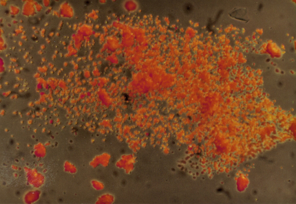 A picture through the microscope of the crystals of an ‘orange mineral’ (Pb3O4) from Paris (magnification 200x).