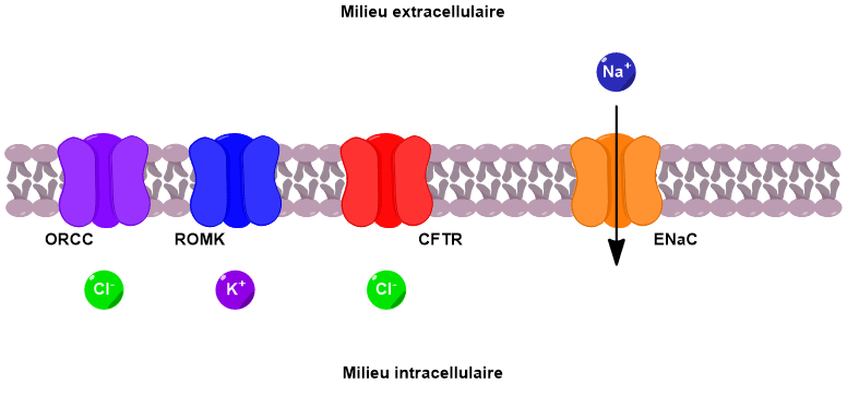 Le canal CFTR permet de faire passer des ions chlorure du milieu intracellulaire vers le milieu extracellulaire. Sous l’effet de ce flux d’ions chlorure, deux autres canaux sont activés, conduisant au passage d’ions potassium et chlorure supplémentaires vers l’extérieur de la cellule.