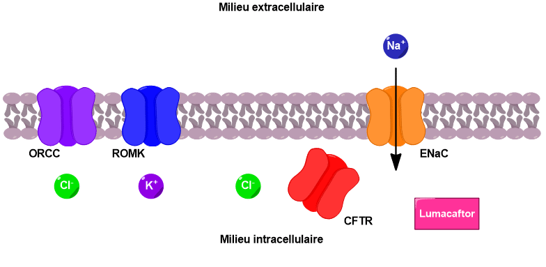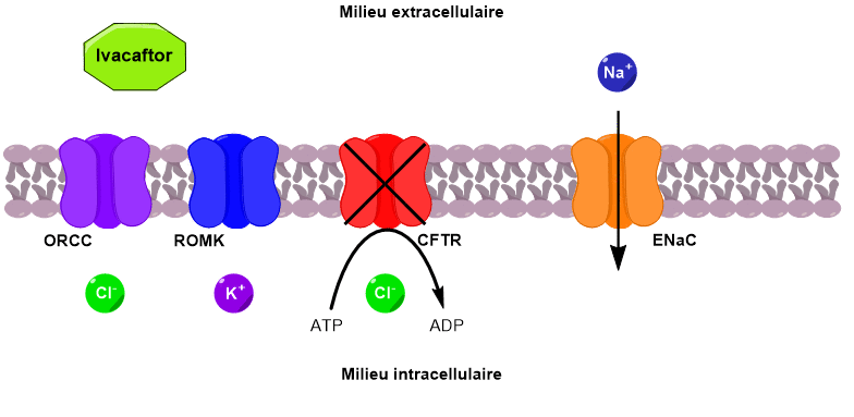L’ivacaftor permet d’améliorer le transport des ions en ciblant les canaux CFTR dysfonctionnels présents sur la membrane. Il permet d’augmenter la probabilité d’ouverture du canal (Figure 6). Ce médicament est donc efficace uniquement en cas de canaux CFTR déjà présents dans la membrane, mais défaillants.