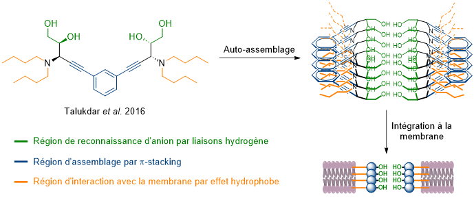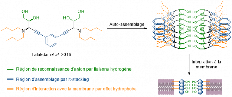 Pour répondre aux problématiques de vitesse et de devenir dans l’organisme, une troisième catégorie a été développée. Il s’agit des pores « auto-assemblés » (Figure 11). Ces derniers forment, par le regroupement de petites molécules, un pore permettant le passage des ions. Cet auto-assemblage repose sur des interactions non covalentes, le plus souvent de type π-stacking. Malheureusement, la nature dynamique de ces structures induit des difficultés pour obtenir une bonne sélectivité des anions à transporter.