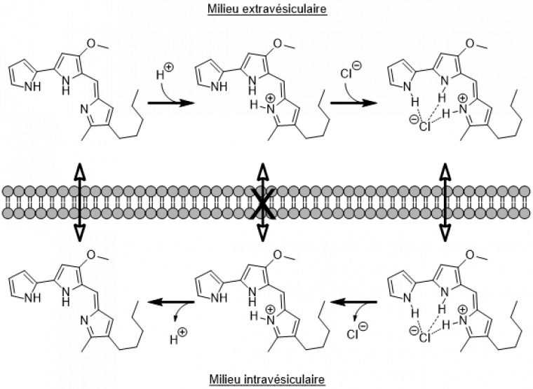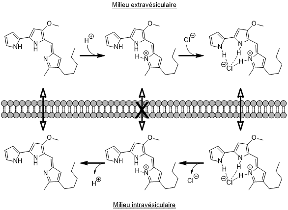 L’une des sources d’inspiration majeures de cette approche est une molécule naturelle, la prodigiosine. Cette molécule est produite par les bactéries de l’espèce Serratia marcescens. Elle peut assurer le passage d’ions à travers les membranes lipidiques des organelles des cellules, notamment des lysosomes.[3,4] La prodigiosine fixe un ion H+ puis, par la combinaison d’une liaison ionique et de deux liaisons hydrogène, capte un ion chlorure avant de lui faire traverser la membrane et de le relâcher dans le milieu intravésiculaire ou extravésiculaire (Figure 8). Ce transport a été observé en temps réel par Cheung et son équipe en 2018.[5]