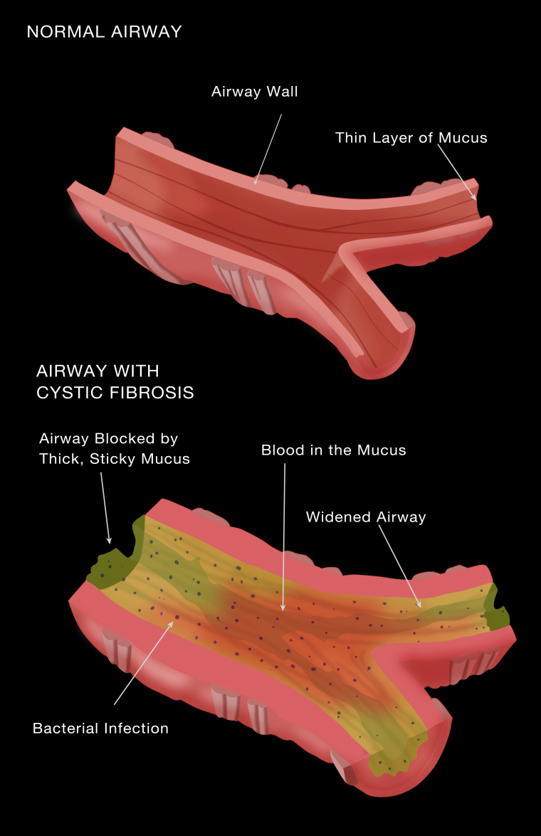 En cas de mucoviscidose, le mucus est épais et difficile à évacuer. Chargé de bactéries, il s’accumule dans les poumons et provoque l’obstruction progressive des voies respiratoires. Les bactéries y trouvent un milieu favorable à leur multiplication, ce qui engendre des infections et des inflammations, avec le risque, à terme, de provoquer des lésions pulmonaires irréversibles. [2]