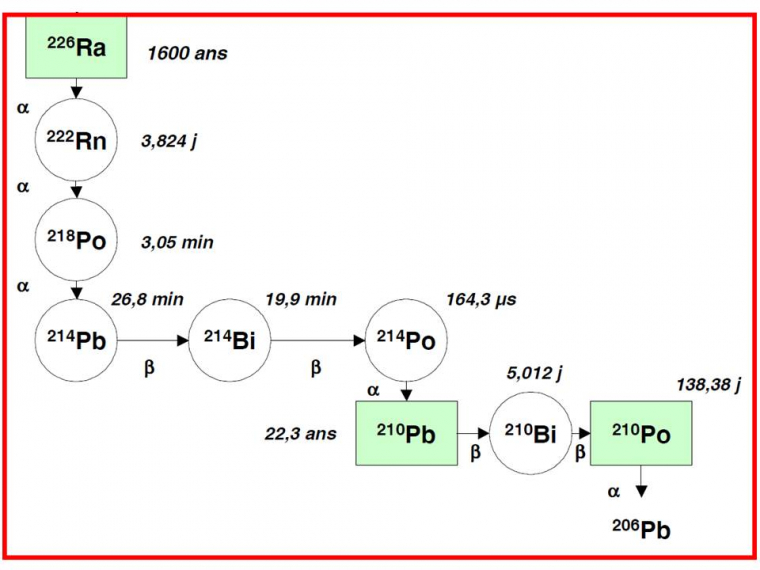 Le radium est un élément de la famille des alcalino-terreux. Il en existe 25 isotopes mais seuls quatre sont présents dans la nature. Parmi eux, le plus abondant est le 226Ra qui se caractérise par une période de 1600 ans environ.