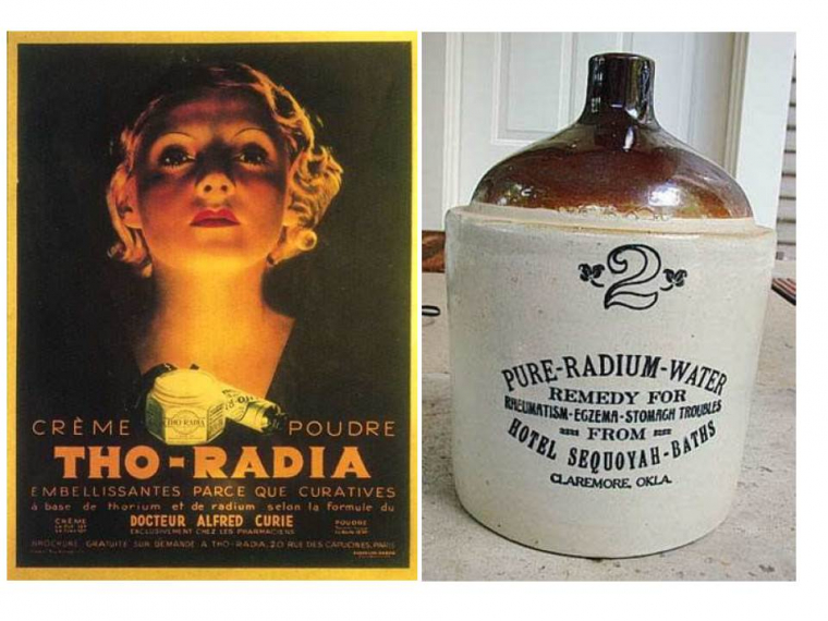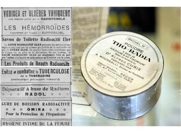 Le radium, grâce à ses propriétés radioactives, suscite l'enthousiasme jusqu'aux années 1940. Il est ainsi décliné dans divers domaines tels que la radiothérapie, la pharmacologie, l'industrie ou encore dans la vie quotidienne.