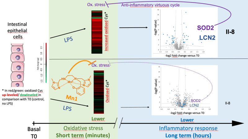 Ces travaux ont été menés sur une lignée de cellules épithéliales intestinales d’origine humaine, dont le niveau de stress oxydant et d’inflammation a été suivi par une méthode dite de kinetic redox shotgun proteomic strategy. Cette approche analyse les protéines présentes dans un échantillon et est capable de déterminer leur quantité. L’équipe a perfectionné la méthode : ils peuvent aussi quantifier, au sein des protéines, les oxydations réversibles des cystéines, un acide aminé naturellement présent. Cela constitue une signature de la quantité de ROS à un instant donné : ce qui permet de déterminer, dans le temps, l’état redox de la cellule. Dans cette étude, la méthode a été appliquée sur une plage allant de quinze minutes à six heures sur des cellules de l’intestin activées par le LPS, qui conduit à de l’inflammation. De manière intéressante, la présence de Mn1 atténue la première phase d’oxydation, qui a lieu aux temps courts (15-30 minutes), avant même que les cellules ne renforcent leur production de protéines antioxydantes. Ces travaux montrent un lien direct entre le stress oxydant et l’inflammation, le stress oxydant précédant la réponse inflammatoire objectivée par la quantification de l’interleukine 8 (IL8) ou de la lipocaline (LCN2) (voir figure 2).