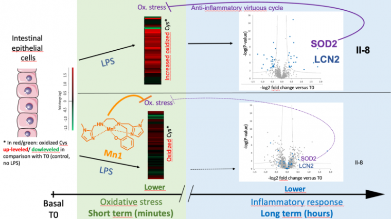 La surproduction de dérivés réactifs de l’oxygène (ROS) et la dérégulation de protéines de protection contre le stress oxydant, comme les superoxyde dismutases (SOD), participent d’une inflammation chronique, que l'on retrouve dans les maladies inflammatoires chroniques de l’intestin. Mn1 est un complexe métallique qui reproduit l’activité des SOD. Comme la SOD2 (SOD mitochondriale), Mn1 possède un ion manganèse (Mn), tout en étant plus simple et beaucoup plus petit que la protéine SOD2. Des chercheurs et chercheuses du laboratoire Chimie physique et chimie du vivant (CPCV, CNRS/ENS–PSL/Sorbonne Univ.), du laboratoire Spectrométrie de masse biologique et protéomique (SMBP, CNRS/ESPCI Paris–PSL) et du Centre de recherche Saint-Antoine (CRSA, Inserm/Sorbonne Univ./EPHE—PSL) ont montré d’une part que l’inflammation induite par le lipopolysaccharide (LPS) démarre par un stress oxydant, et que Mn1 est capable de diminuer à la fois le stress oxydant et l’inflammation.