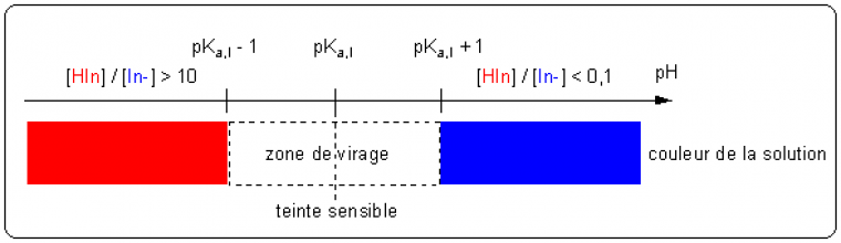 On constate que pour la plupart des substances utilisées, une des deux formes impose sa couleur lorsqu’elle est en quantité dix fois supérieure à l’autre : cela permet de distinguer clairement deux domaines de pH de part et d’autre de pKa,I (cf figure 1). La zone de pH centré sur pKa,I dans laquelle on observe le changement de teinte est appelée la zone de virage. La couleur à pH = pKa,I est la « teinte sensible ». Il faut toutefois remarquer que ce critère au dixième n'est pas universel : il dépend de la nature de l'indicateur coloré, mais également de la sensibilité aux couleurs de l'observateur. Ainsi, un observateur dont l'oeil est plus sensible aux variations de couleurs attribuera une zone de virage plus large à un indicateur donné.