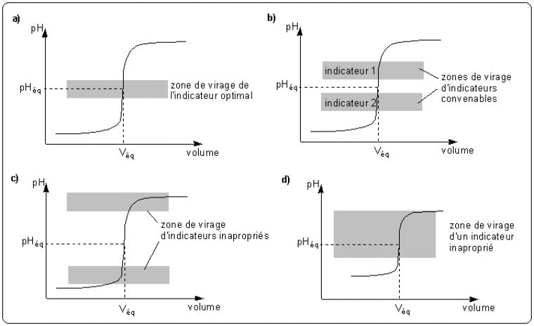 Pour permettre un repérage efficace, la zone de virage de l’indicateur coloré doit être la plus étroite possible et centrée dans la zone où la variation de pH est la plus importante, idéalement de pKa,I = pHéq (figure 2a.) Si le saut de pH est important, un indicateur dont le pKa,I est éloigné de pHéq peut également convenir (figure 2b.) Mais si l’écart entre son pKa,I et pHéq est trop important (figure 2c), ou si sa zone de virage est trop large (figure 2d), alors l’indicateur coloré est inapproprié.