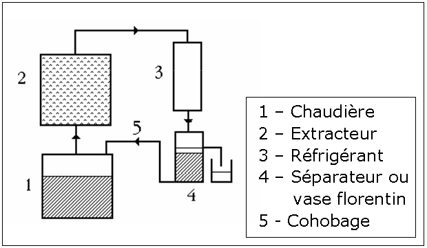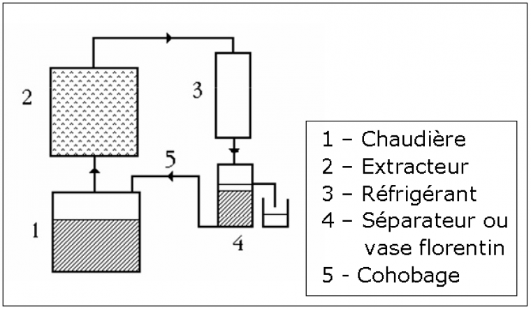 La chaudière (1) produit de la vapeur d'eau qui est envoyée dans l'extracteur (2) dans lequel se trouve le produit végétal dont on veut extraire les composés d'arôme. Après condensation dans un réfrigérant (3), la phase aqueuse est séparée de la phase lipidique dans un vase florentin (4). La phase lipidique mise en jeu dans cette méthode est moins dense que la phase aqueuse. On récupère la phase lipidique contenant la majorité des composés d'arôme et qui est appelée huile essentielle. La phase aqueuse est réutilisée en étant réinjectée dans la chaudière, c'est ce que l'on appelle le cohobage (5). On peut également récupérer cette eau résiduelle, comportant une faible proportion de composés d'arôme, qui porte alors le nom d'eau florale.