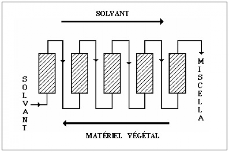 La circulation du solvant se fait à contre courant du matériel végétal, ce qui permet d'optimiser le rendement de l'extraction. Le solvant du miscella est éliminé sous pression réduite, on obtient alors une oléorésine. Parmis les principaux solvants utilisés citons l'hexane (68,7°C), l'acétate d'éthyle (77,1°C), le dichlorométhane (39,8°C) et l'éthanol (78,5°C).