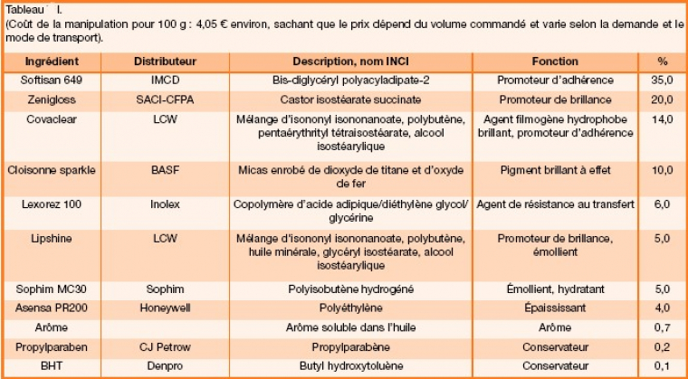 Fabriquer un gloss est simple en soi. Souvent monophasique, parfois en émulsion, il contient relativement peu d’ingrédients et ne nécessite pas d’équipement complexe, ni de grandes précautions au niveau des manipulations. Mais formuler un gloss possédant toutes les qualités qu’un consommateur pourrait exiger est un véritable challenge. Ce terrain est d’ailleurs très propice pour la recherche fondamentale sur les polymères, par exemple de nouvelles silicones ou des composes perfluorés, capables d’allier sécurité, brillance, hydratation, tenue, non transfert et une sensation idéale.