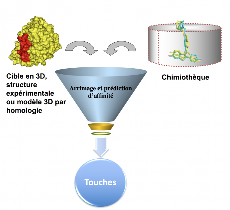 Lorsque la structure 3D de la cible biologique d’intérêt est disponible, les méthodes basées sur la structure du récepteur ou cible peuvent être employées pour réaliser le criblage virtuel. Dans un premier temps, le logiciel positionne les petites molécules chimiques déjà générées en 3D dans une poche ou sur toute la surface de la cible. Un score sera ensuite calculé pour essayer de prédire l’affinité des composés envers la cible. Il sera alors possible de classer les molécules par ce score théorique. Dans la pratique, plusieurs points sont à souligner. Les cibles et les petites molécules sont généralement flexibles. Pour aller plus vite, quand il y a des millions de molécules à traiter, on suppose que la cible est rigide et, dans ce cas, seule la flexibilité des ligands est explorée. Il est possible de préparer plusieurs conformations de la cible (par exemple par dynamique moléculaire) et de faire du « docking » sur les différentes structures 3D de la cible et de fusionner ensuite les résultats. Ensuite, il faut savoir que l’étape de « scoring » est une étape sensible, les scores calculés ne sont en général pas très précis, et il faut donc utiliser plusieurs approches dites de « post-processing » qui impliquent des calculs d’énergie d’interactions cible-ligands beaucoup plus longs et complexes. Les forces ou paramètres sous-jacents à la liaison d’un ligand à son récepteur sont d’une part la complémentarité de forme, et d’autre part l’établissement d’interactions entre le ligand et le site de liaison, que ce soit des liaisons hydrogènes, des interactions électrostatiques et des interactions de Van der Waals ou encore des interactions hydrophobes. Classiquement, on trouve trois grands types de fonctions de score : les fonctions de scores basées sur les champs de force, les fonctions de scores empiriques (qui tentent de reproduire des données expérimentales d’énergies de liaison), et les fonctions de scores basées sur les connaissances (statistiques). De nouvelles fonctions de score sont à présent disponibles, elles ont été développées avec des méthodes d’apprentissage et entraînées sur des nouveaux jeux de données. Le choix d’une fonction de score est critique, et actuellement aucune fonction de score existante n’est parfaite car il y a un certain nombre d’approximations. De plus, les molécules d’eau ne sont généralement pas traitées. Malgré ces problèmes, il est pourtant possible de sélectionner les molécules avec ces fonctions mathématiques. Néanmoins, les experts du domaine ne font jamais pleinement confiance à une fonction de score, ils en utilisent plusieurs et analysent sur l’écran de l’ordinateur à l’aide de logiciels de graphique moléculaire les complexes cible-ligands prédits.