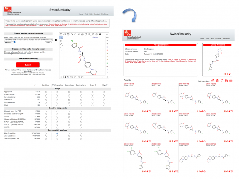 Il faut ensuite copier et coller cette formule chimique dans SwissSimilarity, et sélectionner une chimiothèque déjà préparée sur le site pour rechercher des molécules similaires. Ces molécules proches de la molécule de départ, ici le rivaroxaban, ont en théorie de fortes chances d’être aussi actives sur le facteur X, sachant qu’en général, quand des molécules sont très similaires elles ont souvent la même activité biologique (c’est le principe de similarité). Il faut également choisir l’algorithme de recherche : la méthode FP2 (empreinte moléculaire) est ici sélectionnée et la base de données peut être la « Zinc Drug-like » qui contient plus de 10 millions de molécules généralement disponibles chez les vendeurs de produits chimiques (Fig. 5).