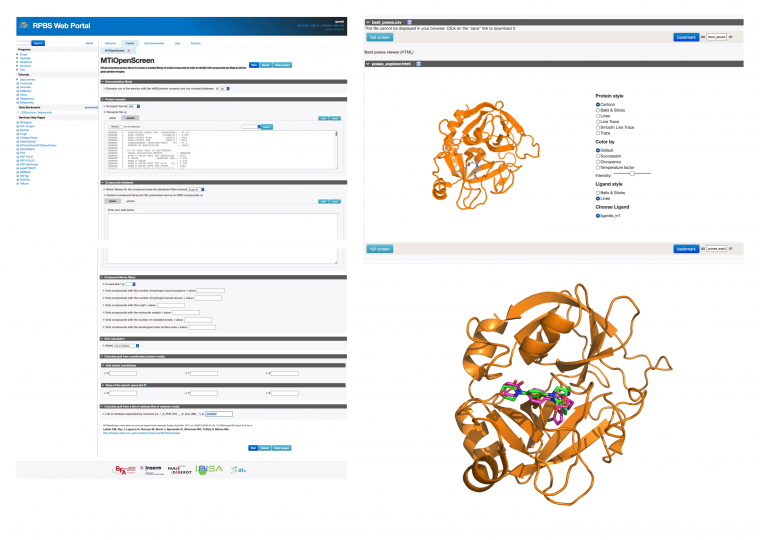 L’utilisateur donne la structure 3D de sa cible et peut arrimer des molécules déjà préparées ou ses propres molécules. Il est possible de visualiser les molécules positionnées dans la poche par le calcul théorique. Dans ce cas, le « docking » est fait avec le logiciel AutoDock Vina. On peut voir sur la figure à droite, la protéine, le facteur X (en orange), avec son inhibiteur arrimé par le calcul (en vert) avec la structure expérimentale (en violet).
