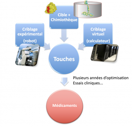 Le criblage expérimental robotisé et le criblage virtuel permettent d’évaluer des milliers ou des millions de petites molécules, stockées dans une chimiothèque (réelle ou virtuelle) et d’identifier des molécules « touches » actives sur une cible ou une cellule.