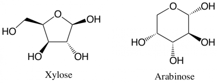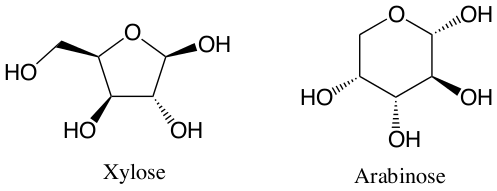 Ce sont des sucres infermentescibles. Ils sont présents sous forme de traces dans le moût puis se retrouvent tels quels dans le vin car ils n’ont pas été consommés par les levures lors de la vinification. Ils sont présents en concentrations faibles dans le vin final (environ 1 g/L). Ils présentent tous un goût sucré plus ou moins prononcé ; certains comme le xylose ou l’arabinose (Figure 8), ne sont pas métabolisés par l’organisme et se retrouvent donc tels quels dans les urines.